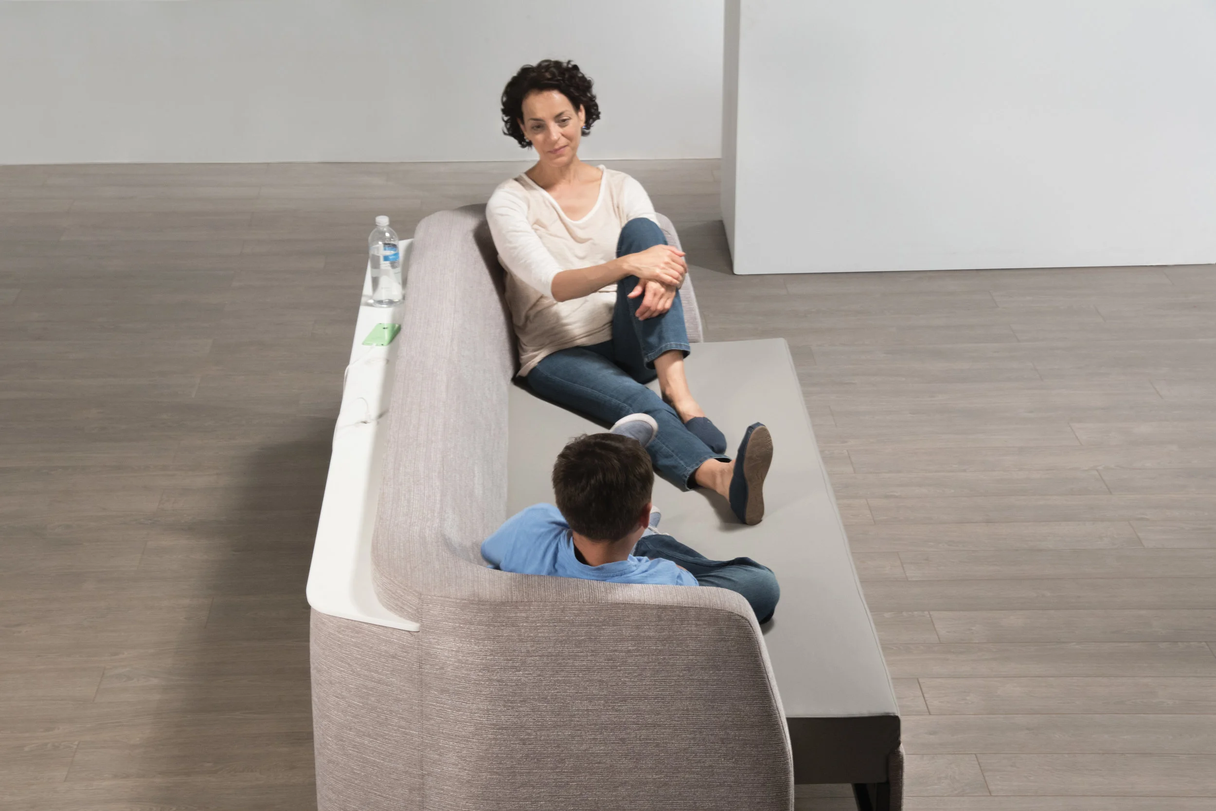 With the ease of a front pull release, the seat deck slides out to the needed Chaise Sleeper depth. Families are encouraged to engage in active communications with the patient as well as with the other visiting family members. This seating configuration promotes “cuddle time” an act of comfort that has been supported by research to help people release stress and anxiety during intense recuperative periods. Because of the variety of comfortable positions, families can also provide company to the patient while maintaining daily activities such as working or reading.